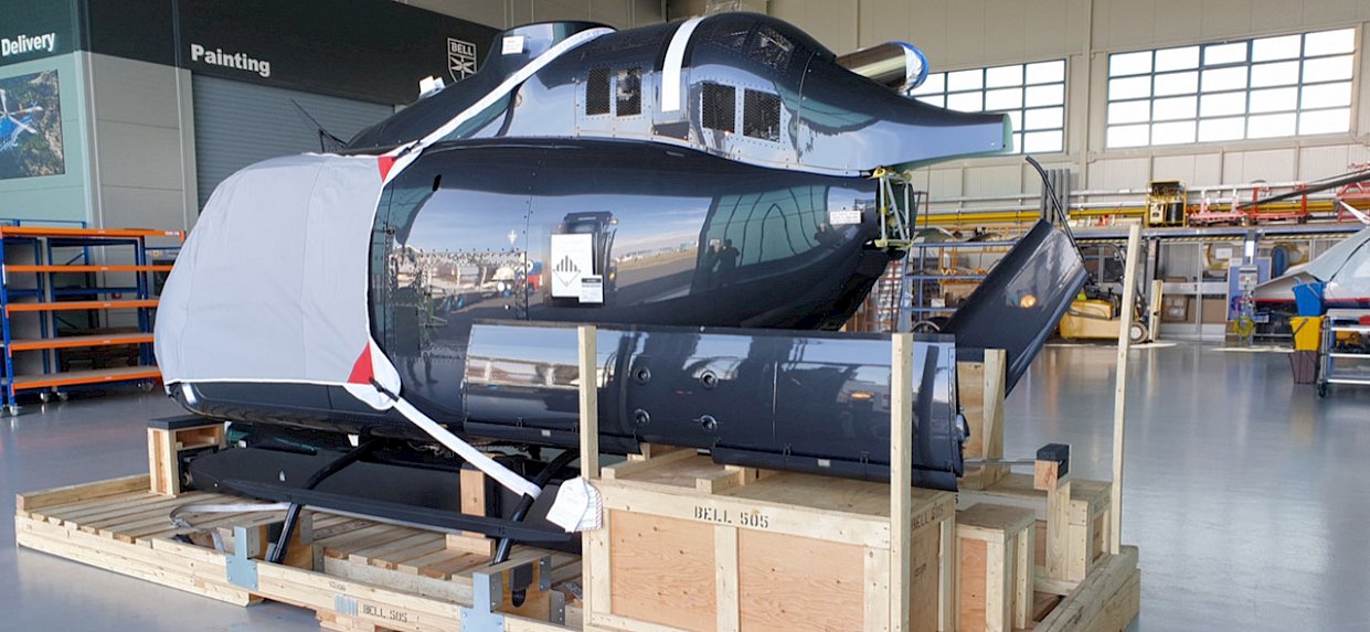 Bevor wir mit ihr endlich durchstarten können, müssen wir uns noch etwas gedulden. In montagefähige Bauteile zerlegt, erreichte unsere 505 die europäische Kundendienststelle von Bell in der tschechischen Hauptstadt Prag. Dort wird sie endmontiert. Das heißt, es beginnt der finale Zusammenbau und die Montage der Sondereinbauten. Im Anschluss wird sie im Rahmen von weiteren Einstellungsflüge noch einmal ihre außergewöhnlichen Flugeigenschaften unter Beweis stellen.